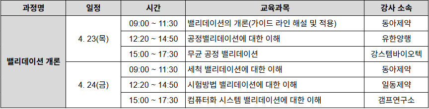 💊 [GMP] 밸리데이션 개론 4/23(목)~24(금) 과정안내 |