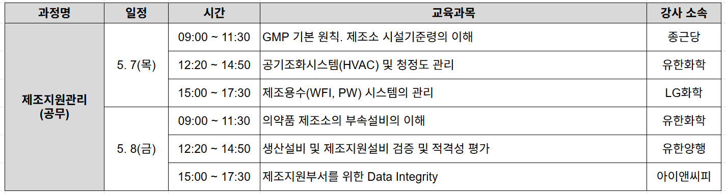 💊 [GMP] 제조지원관리(공무) 5/7(목) ~ 5/8(금) 과정 안내 |