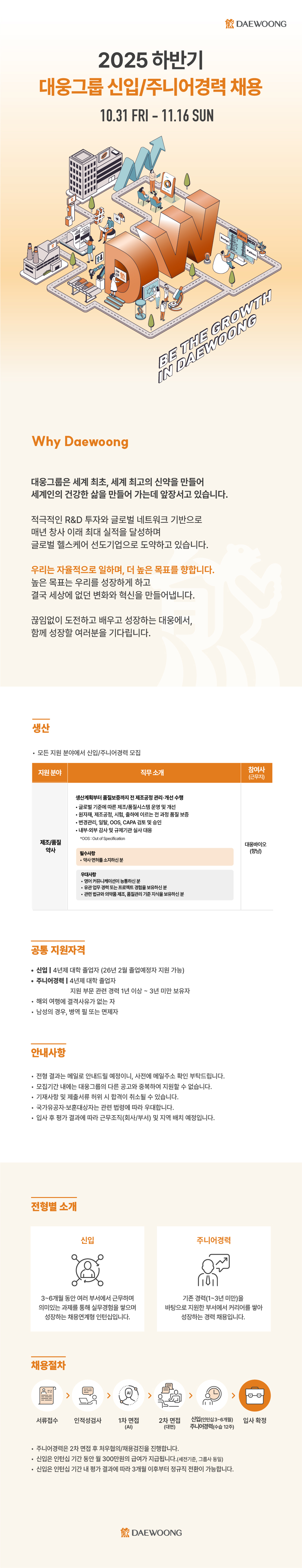 • 지원방법 : 대웅그룹 채용 홈페이지를 통해 지원서 접수